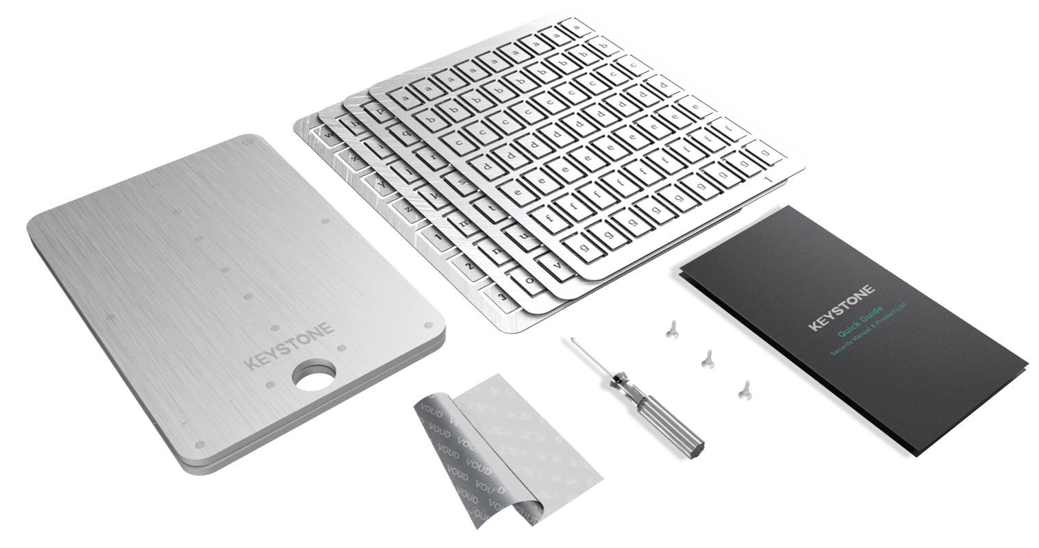 Keystone Tablet Plus, 4 Sheets of metal letters, 2 Tamper-Proof stickers, Extra screws, Screwdriver, Quick Guide