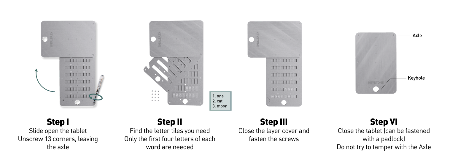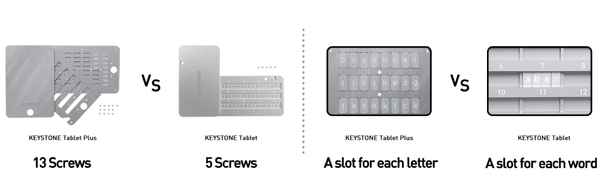 Double-sided storage supports 12, 18, and 24-word recovery phrases (BIP39 specifies only the first 4 letters are needed to identify each word).